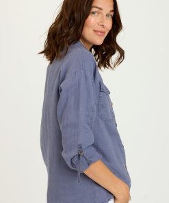XCVI Women’s Tops Senneca Textured Satin Shirred Peplum Button-up Blouse | Ocean Storm Pigment