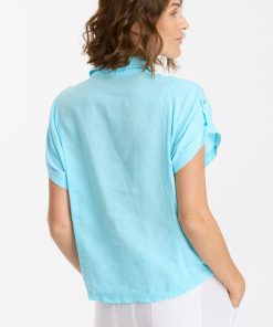 In light linen, Abner features a traditional collar, dolman sleeves, raw-edge patch pockets, a ruched hem with elastic sides, tabbed short sleeves, and contrasting back side panels in slub jersey.