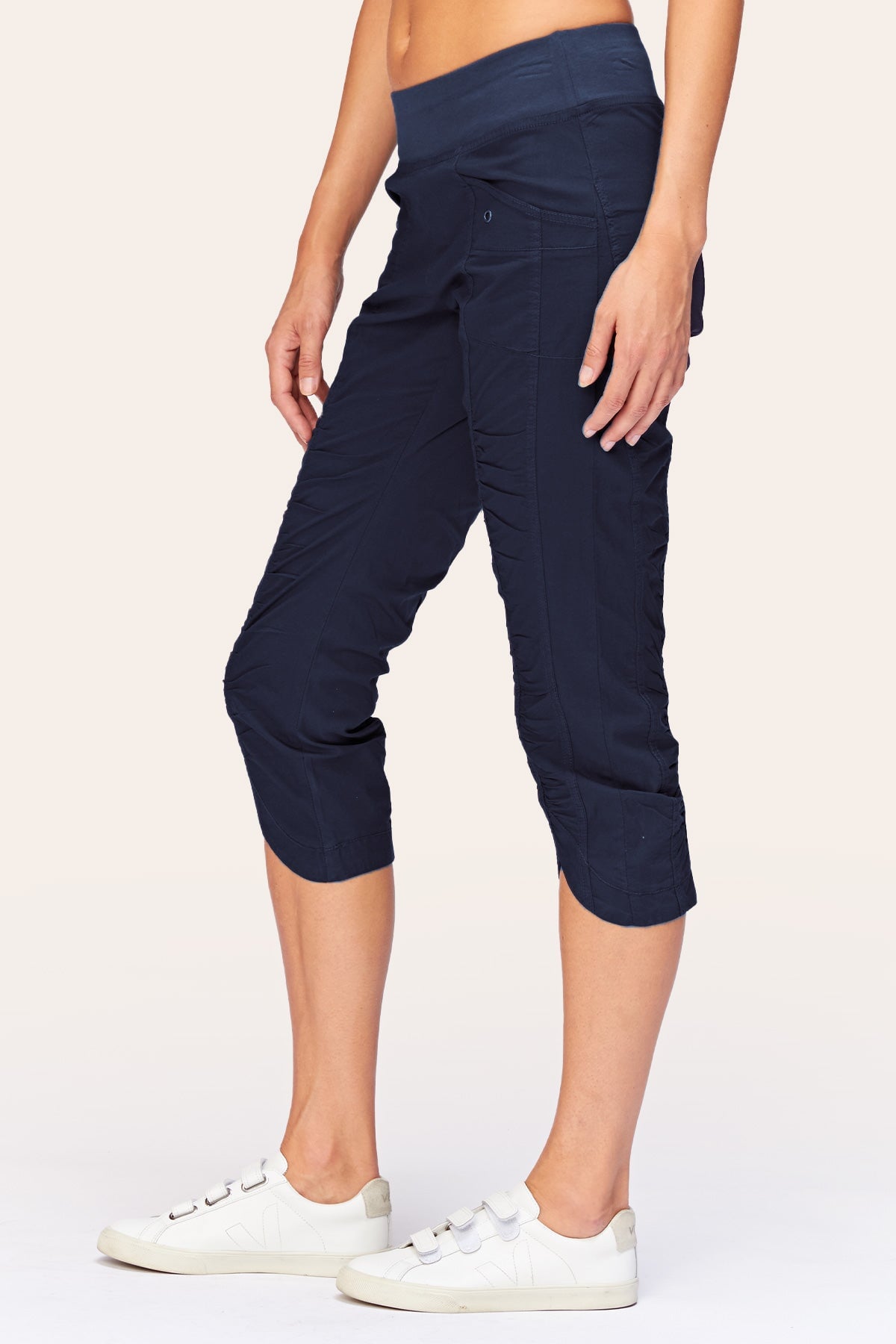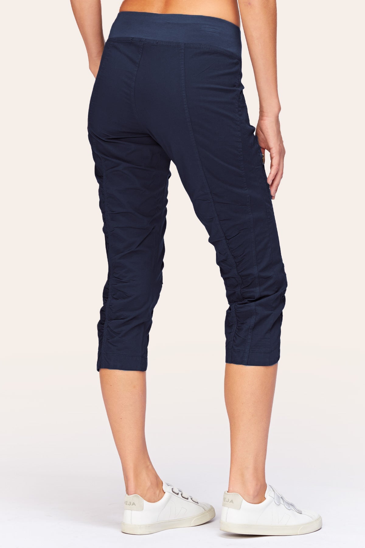 This poplin crop features a fitted silhouette, two front pockets, zip side pocket, ruching on pant leg, and scalloped hemline.