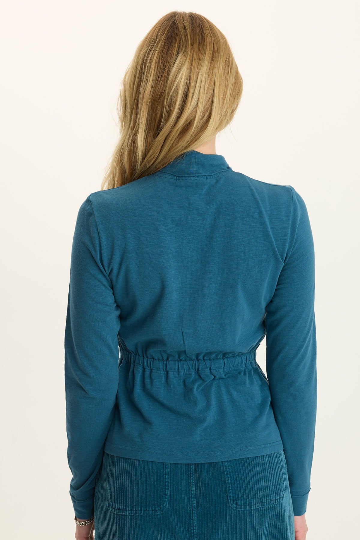 Elastic cinching in back creates a contoured effect with a light peplum silhouette on this mock-neck top. Style lines add even more flattering flair for a fun twist on your classic turtleneck.
