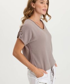 In a traditional XCVI silhouette, Bower V-Neck Tee has tabbed short sleeves, mesh trim inserts, a cinchable bubble hem and a contrasting slub jersey back panel.