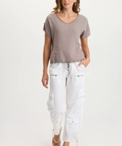 In a traditional XCVI silhouette, Bower V-Neck Tee has tabbed short sleeves, mesh trim inserts, a cinchable bubble hem and a contrasting slub jersey back panel.