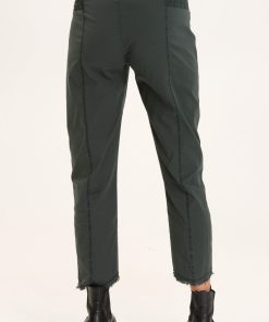 An ankle length slim fit pant with a pull on waist that features shirred panels, two inseam pockets, two patch zippered pockets, and a raw edge rounded hem.