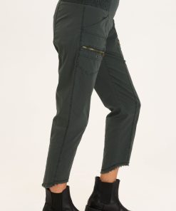 An ankle length slim fit pant with a pull on waist that features shirred panels, two inseam pockets, two patch zippered pockets, and a raw edge rounded hem.
