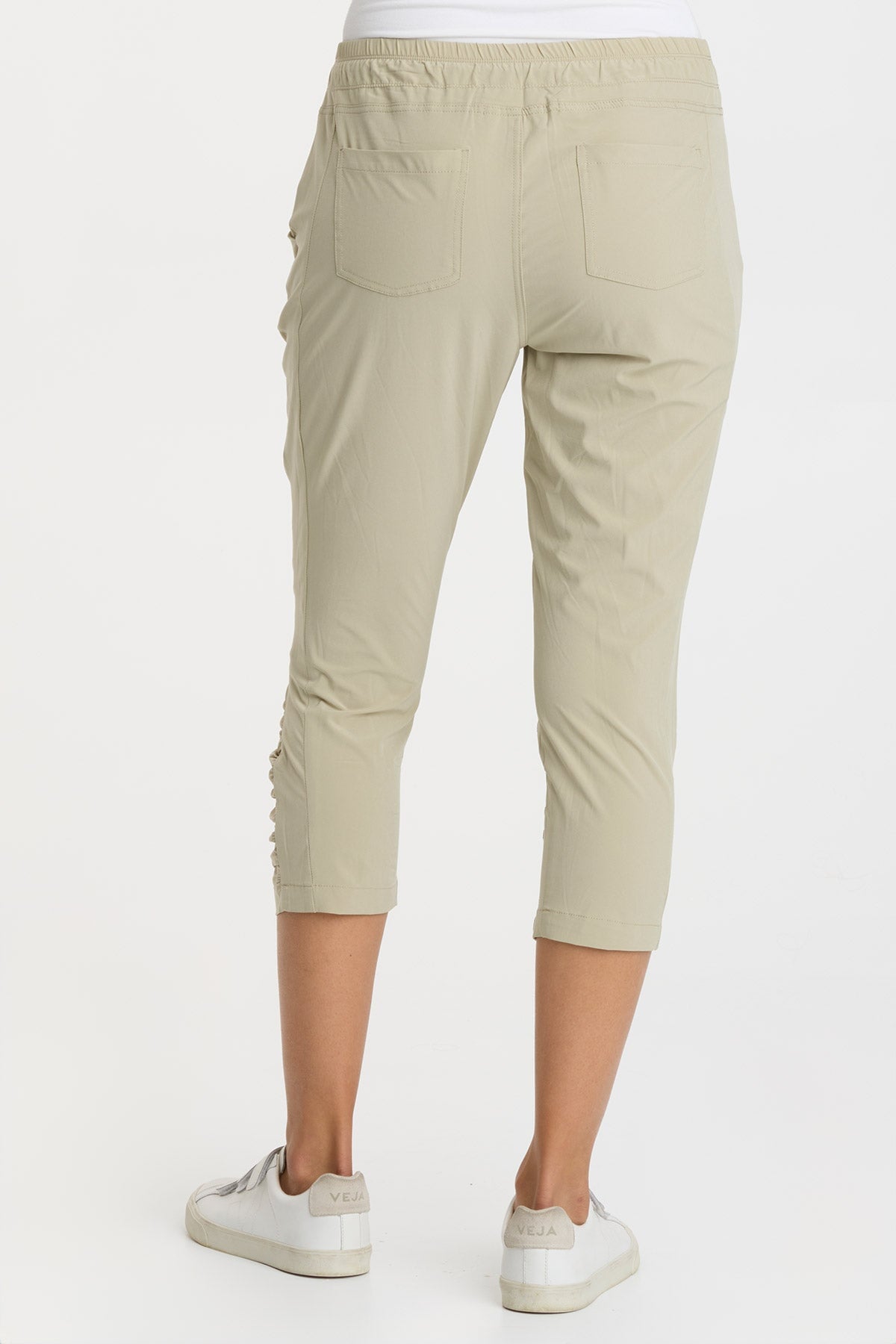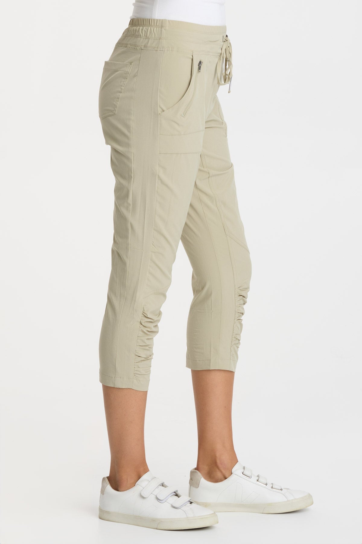 A Jetter spin off; this active legging features a drawstring waist, front pockets with zipper details, our classic ruched leg panels, back pockets and enough sass to keep you going all day!