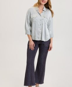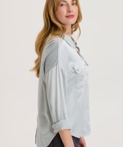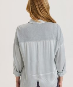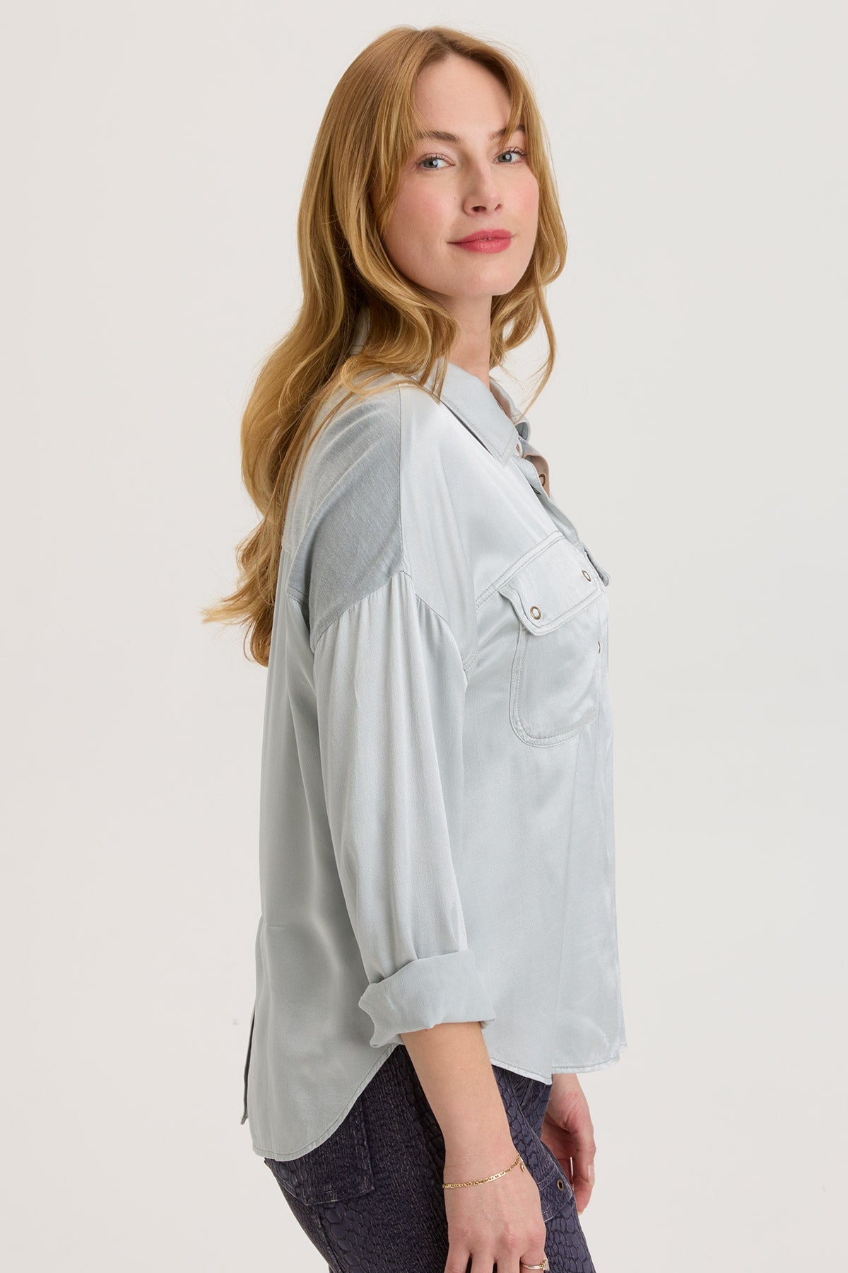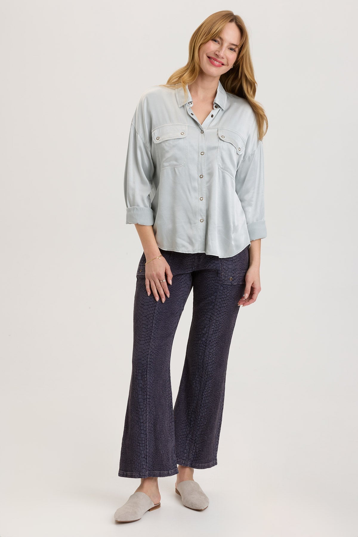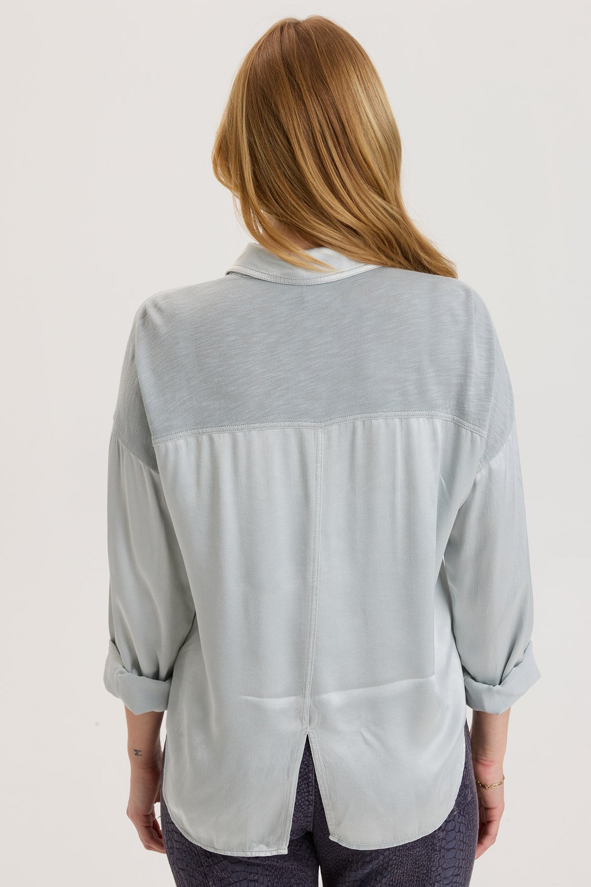 A fun split back hem, traditional “button-up” with snap closure, two breast pockets with flaps and a contrast jersey yoke across the back shoulders.