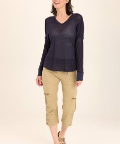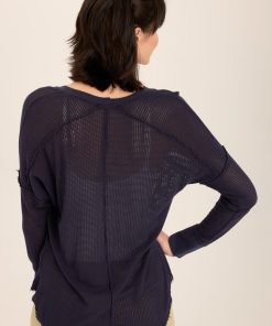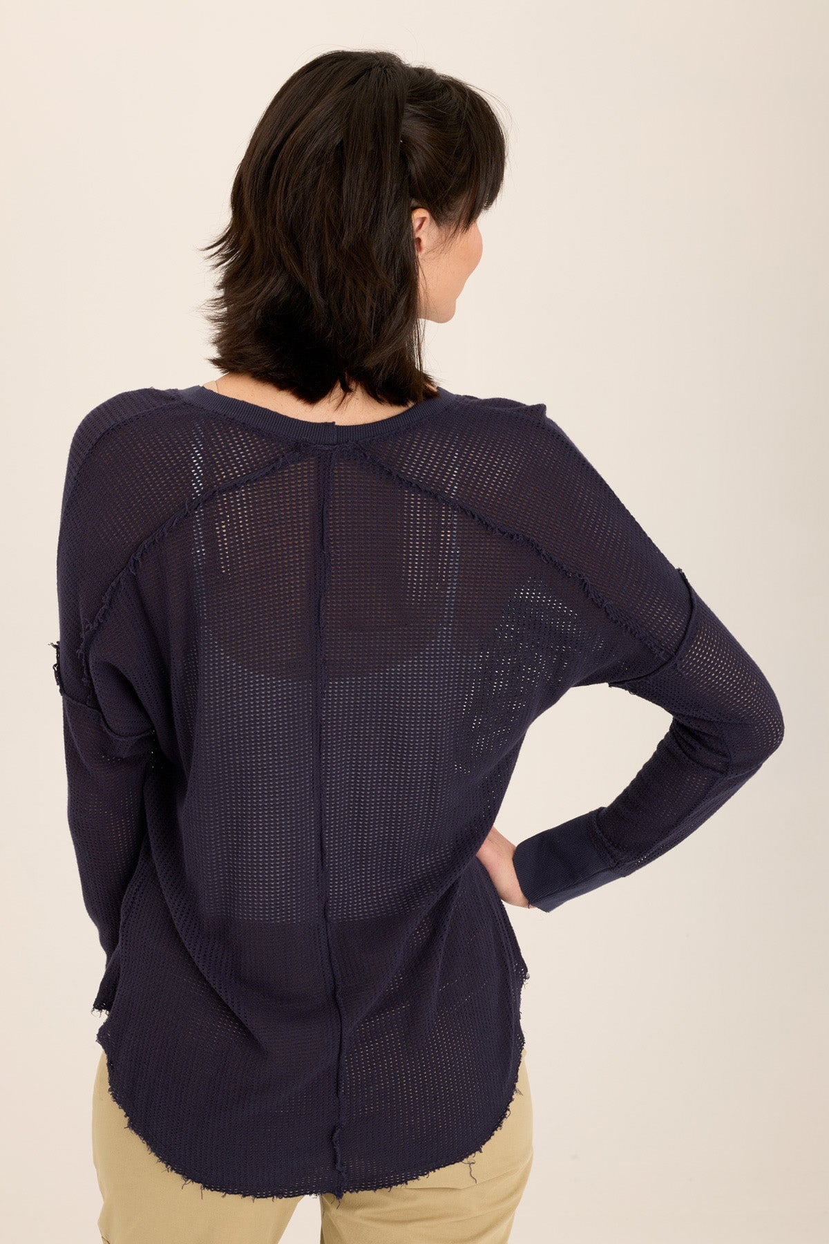An exaggerated V-neck teams up with a drop shoulder look in our latest sweatshirt-like pullover. An airy mesh and rib details make Bullock oh-so-comfy and classy!