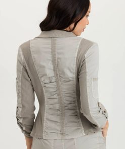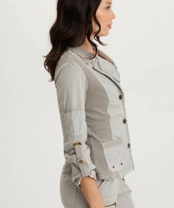 Tabbed 3/4 sleeves team up with a collar of fullness and rib. Featuring rib inserts, front pockets and fun sleeve pockets!