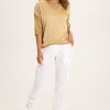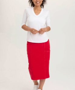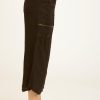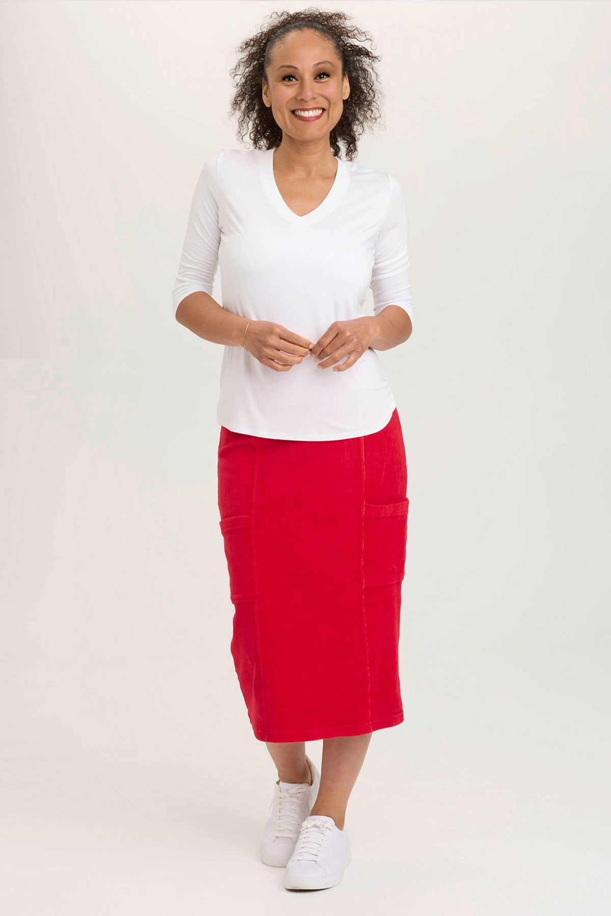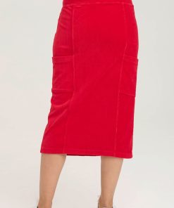 A fitted but functional flared leg opening skirt with cargo patch pockets and a pull-on waist.