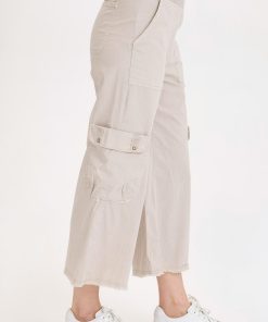A pull-on elastic jersey waistband, plentiful exaggerated cargo pockets, a raw-edge hem, and antique brass hardware all join together in this capri style.