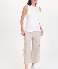 A pull-on elastic jersey waistband, plentiful exaggerated cargo pockets, a raw-edge hem, and antique brass hardware all join together in this capri style.