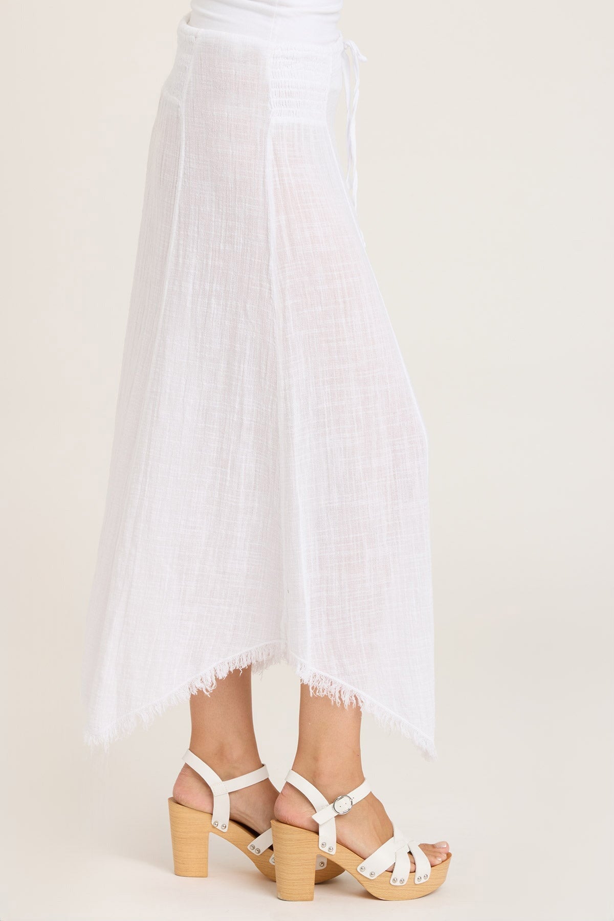Now available in Cocoon Gauze, Zuri brings back the handkerchief hem, this time with raw edges. Seamed just-so in all the right places, Zuri offers a comfy pull-on ruched waist with an adjustable tie.