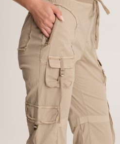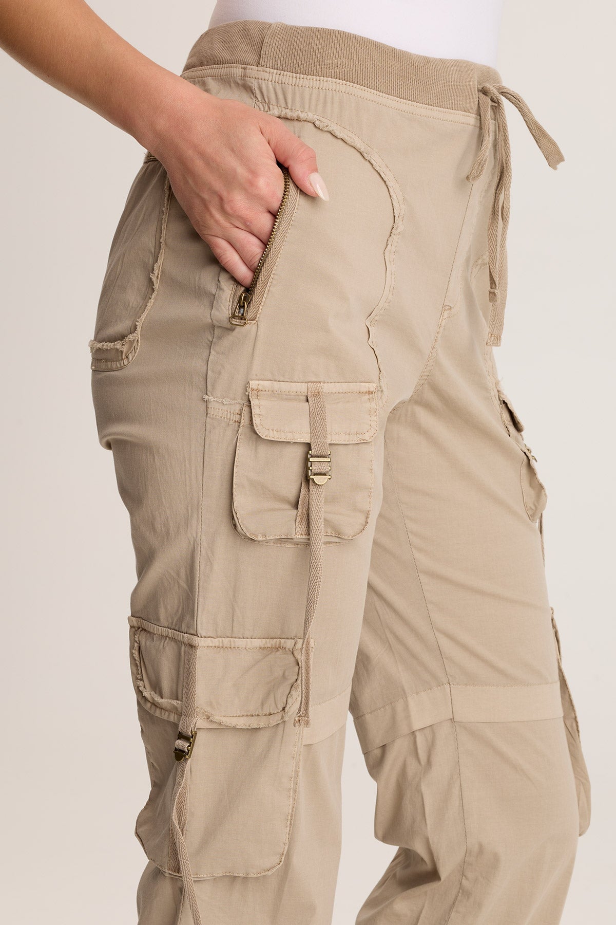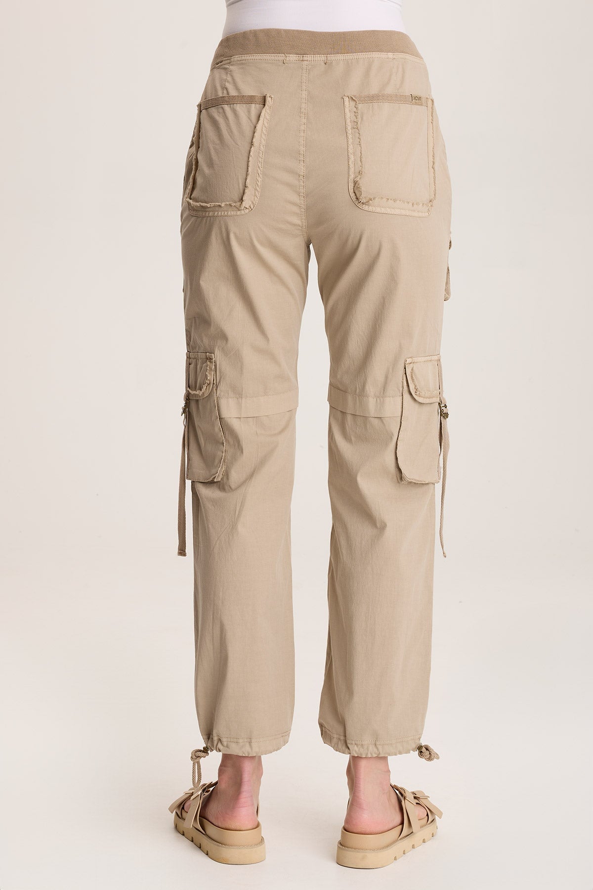 Cinched adjustable leg openings and voluminous tabbed pockets throughout add adventure to this tapered poplin crop.
