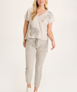Another guest designer artwork piece, this v-neck tee has hand drawn embroidery and a back contrasting panel.