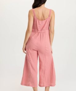 Simply the cutest and sleekest jumpsuit around! Leoda has ruching at the side bust, an elastic cinched back waist, snap up front closure, in-seam pockets and double box pleats dancing along the side seam of the leg.