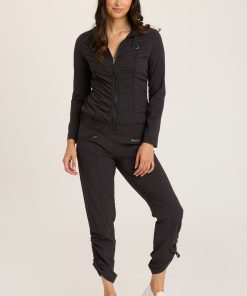 Maximum performance meets the Momentum Jacket in flexible Whisper 4-Way Stretch fabric, designed for sweat-resistant movement and easy comfort. Momentum features allover ruching on the front, an elastic cinched hemline, and a belted buckle detail at the collar for some added chic. Wear for movement or style with a casual bottom for sartorial excellence! Activewear never looks so stylish!