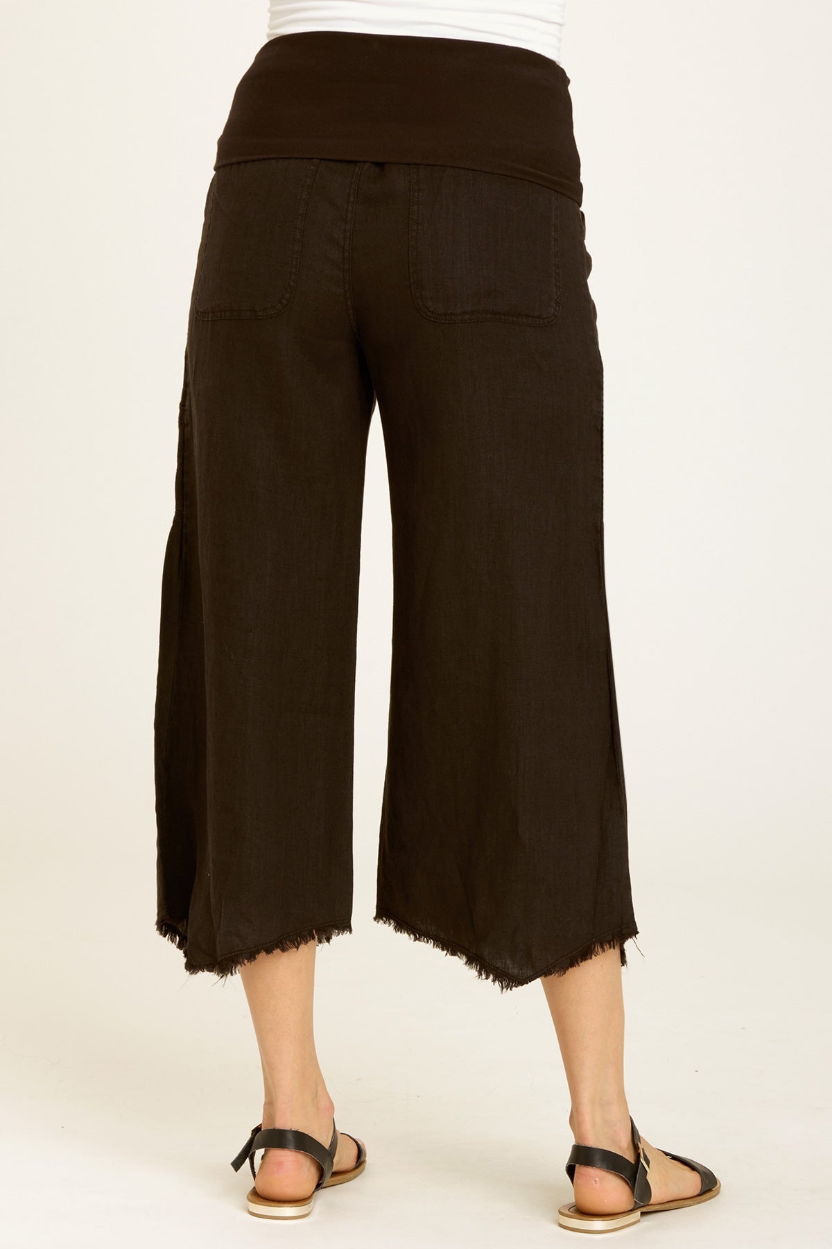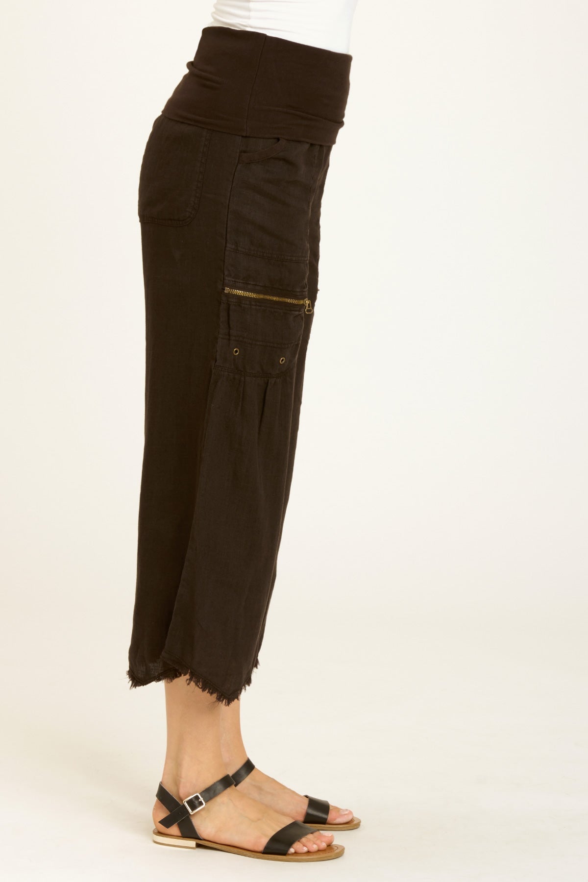 Talk about a sharkbite! Pasqual Crop features raw edges on an asymmetrical leg opening. With a foldover waist and clean cargo pockets, this flowing crop gives structure and fun!