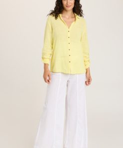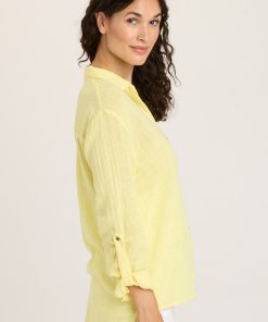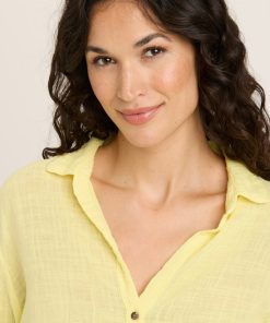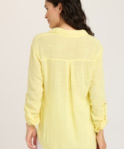 This gauze button-up blouse is great for layering. Features tabbed sleeve for easy rolling, curved hemline, and a box pleat on back.