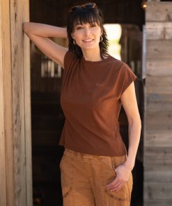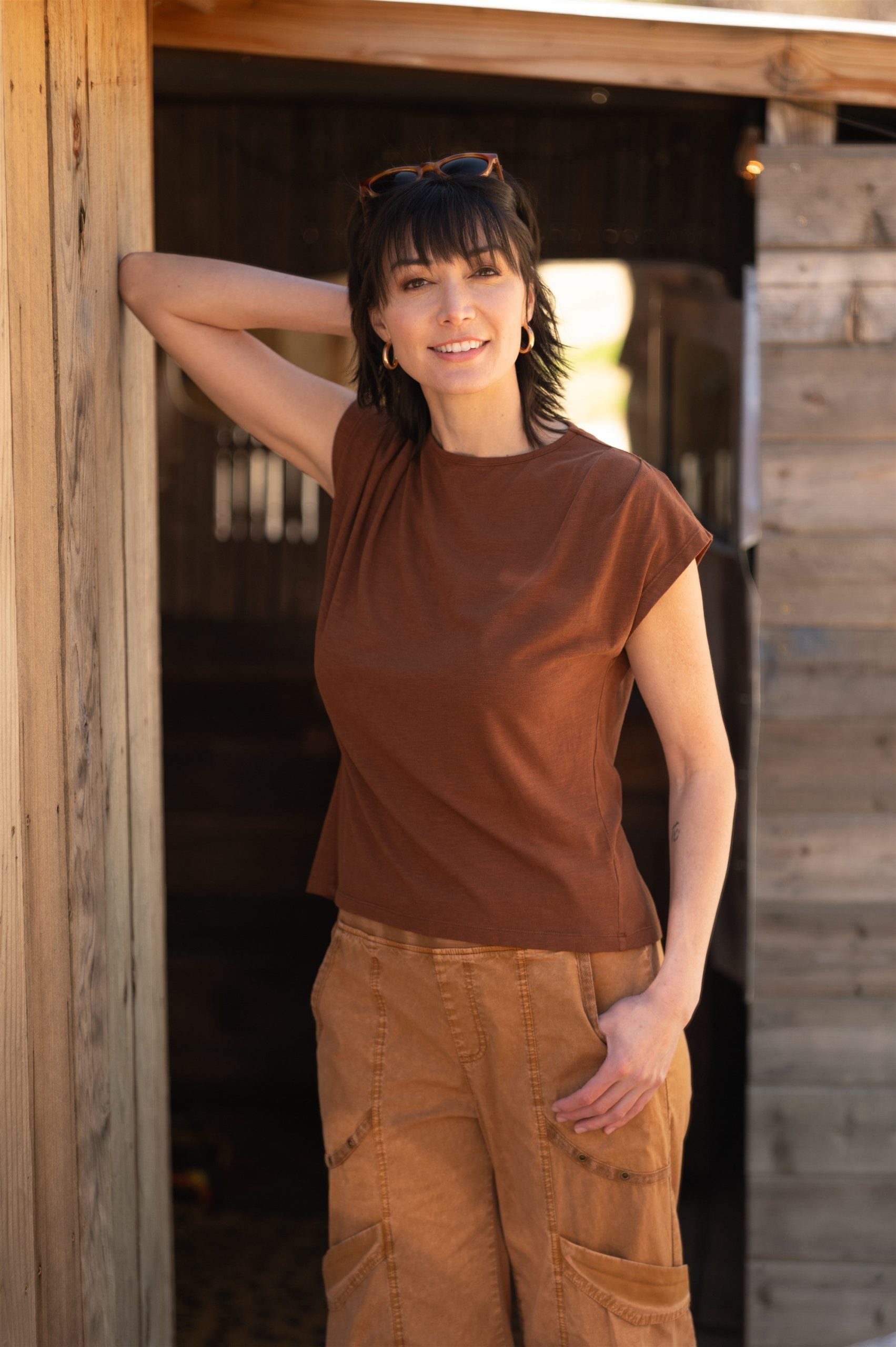 Two pleats adorn the shoulders of this mock neck classic silhouette. In our breezy slub jersey, comfort and style are hand in hand with this stunner.