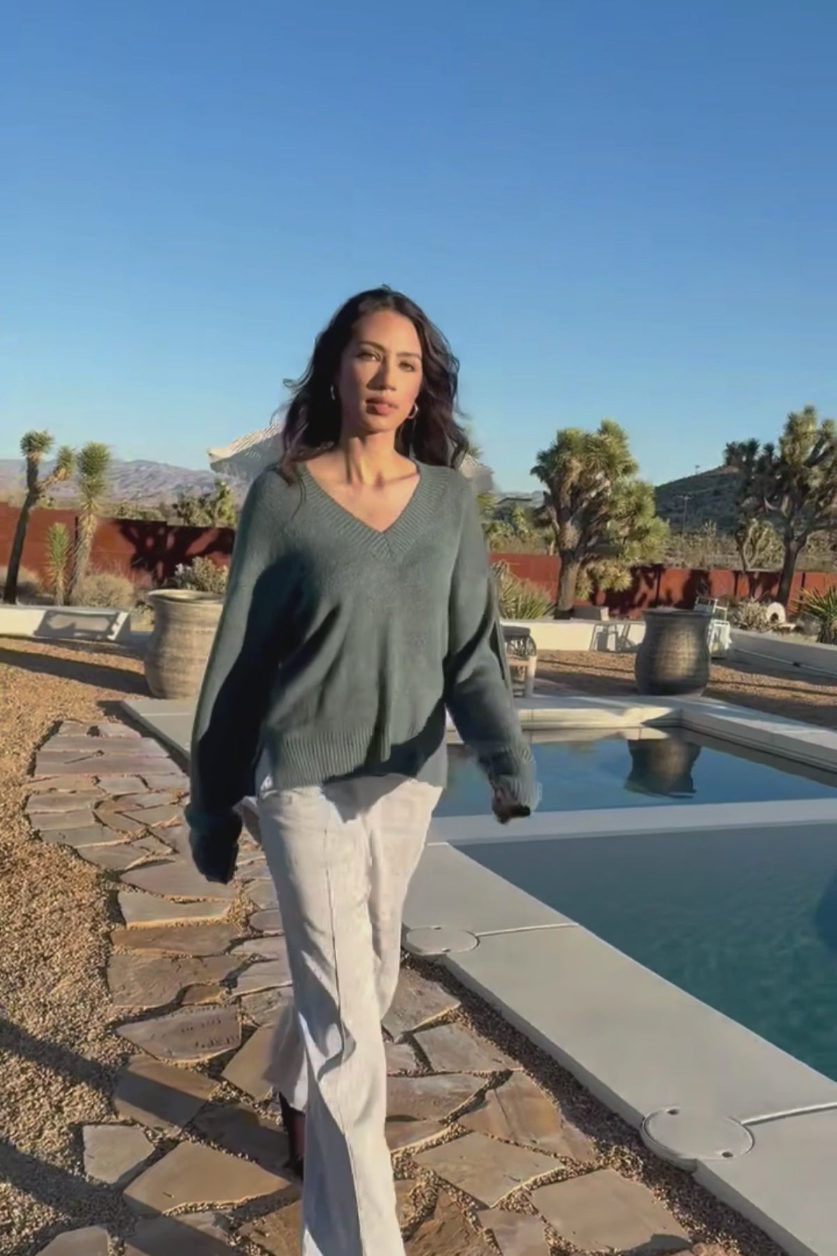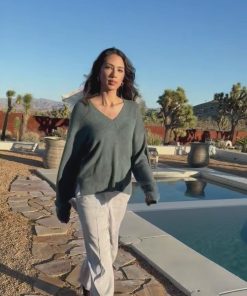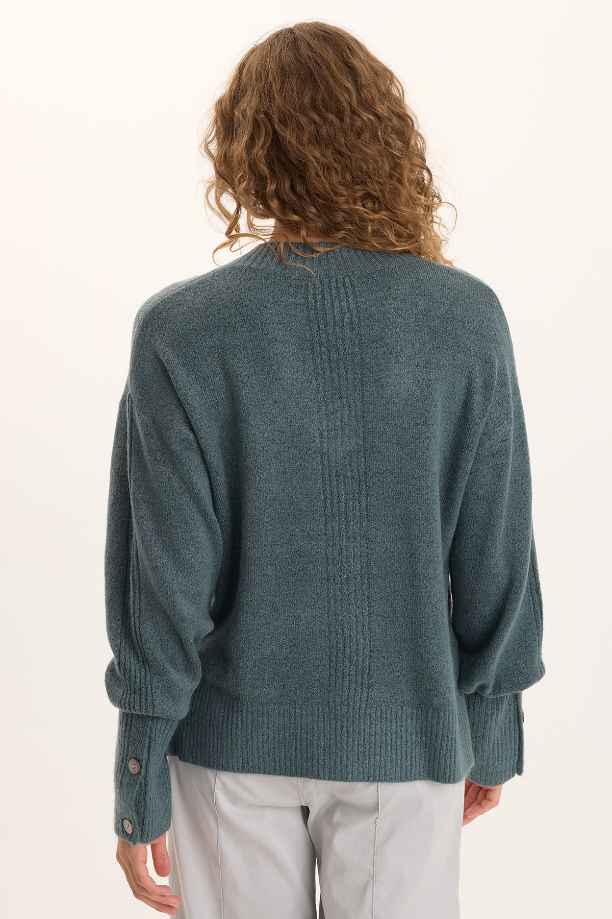 Voluminous sleeves, a relaxed fit, and v-neck collar bring out the ultra-cozy feel of this sweater in our soft Mirelli Knit.
