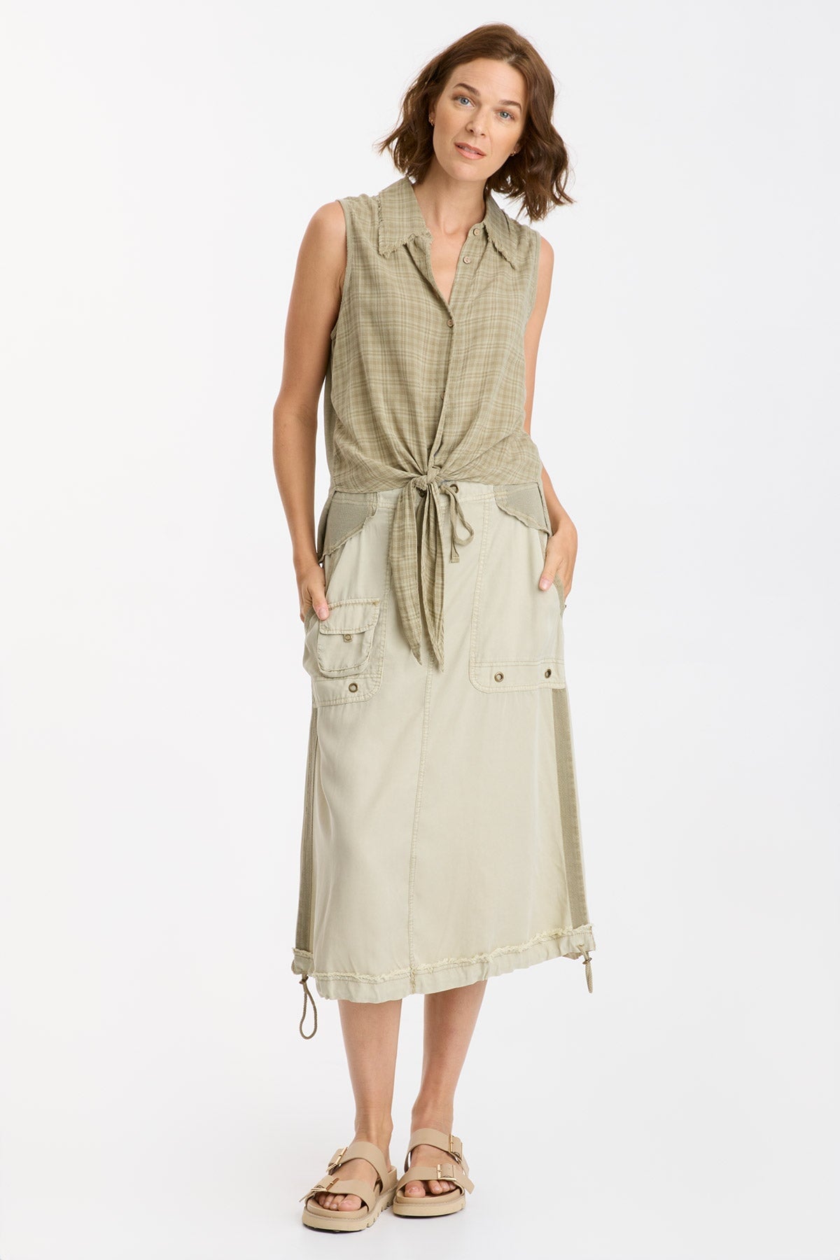 With a cheeky tie-front hem, contrasting jersey back panels, raw-edge collar details, coconut buttons, and a high-low hem, the Fleming Tie Tank is a showstopper in Tarley Plaid Voile.