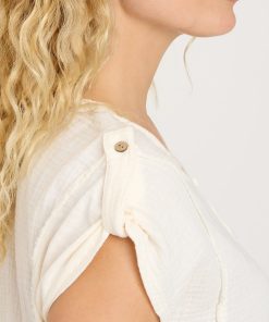 Tabbed short sleeves, a front breast pocket, a unique rounded raw edge hem, and slightly scooped neckline make up the Grigg Tee.