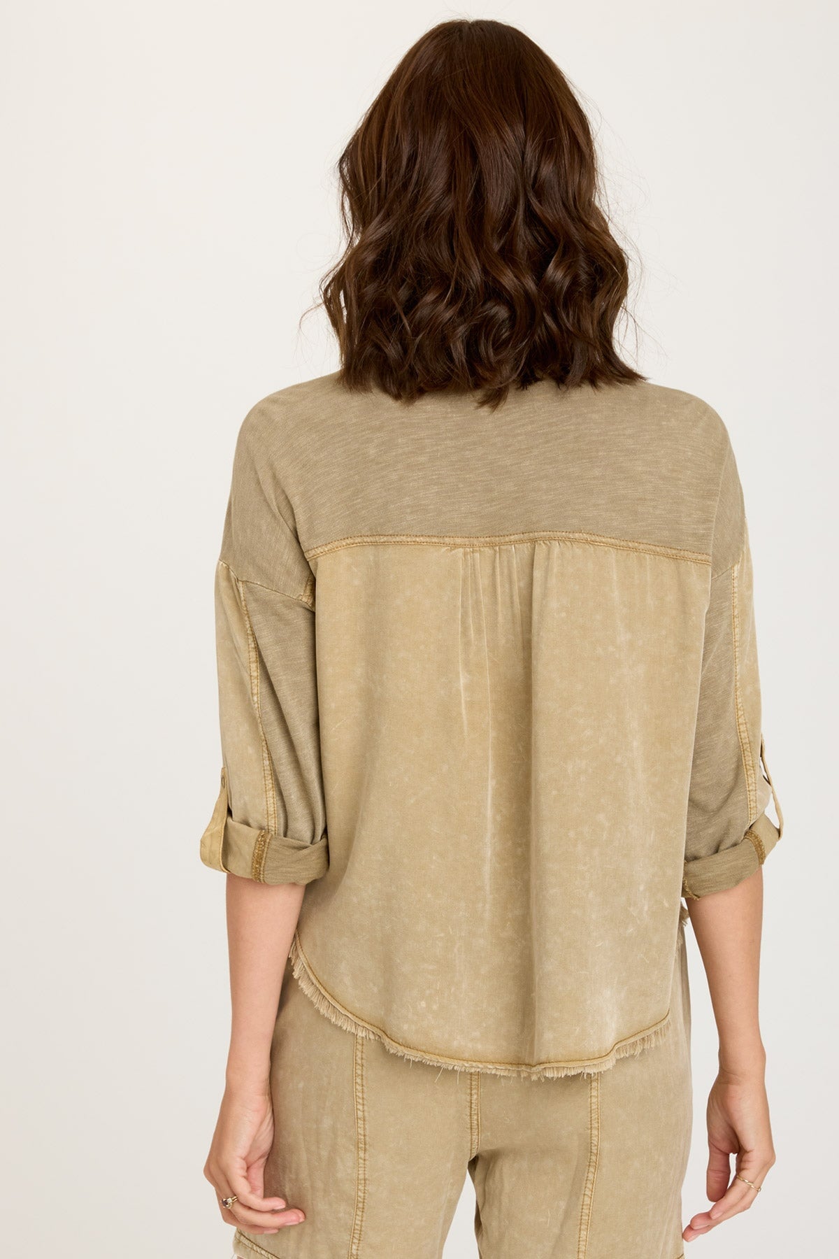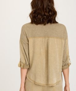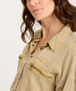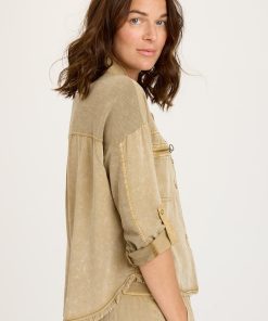Brass ring snaps, zippered breast pockets, a cute collar, a raw-edge hem, slightly cropped fit, and cuffable tabbed sleeves make jacket-inspired Kapp all the rage in Soft Twill.