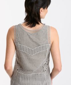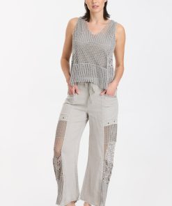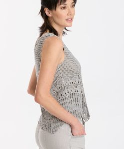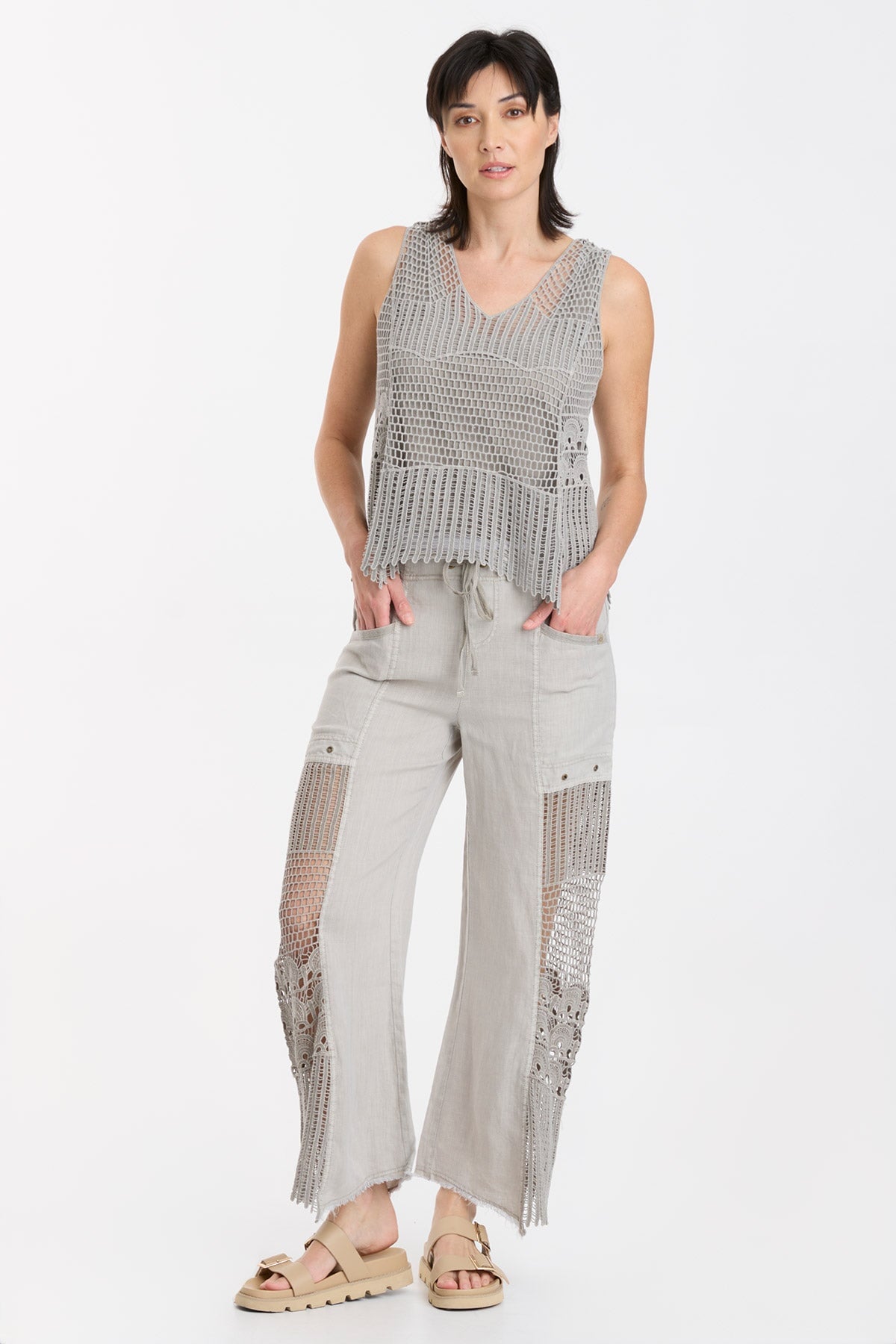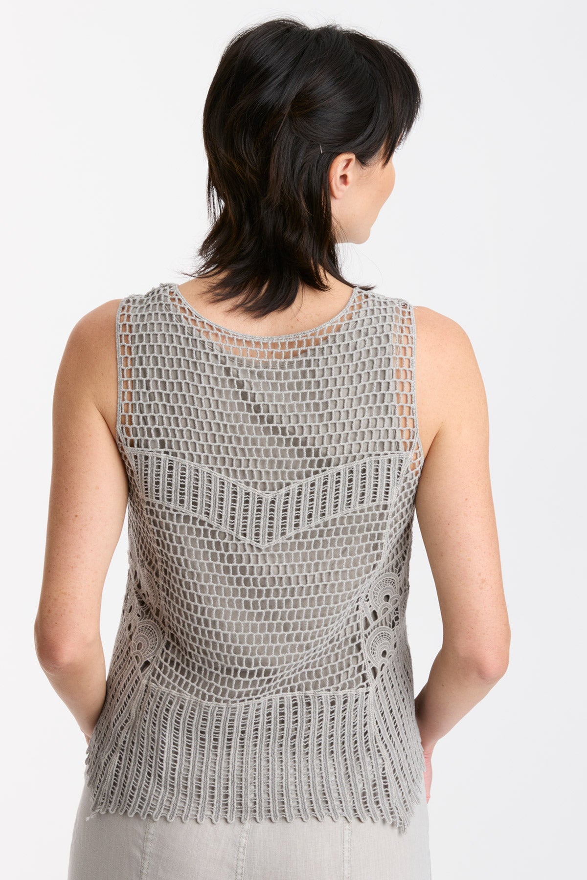 A cotton crochet tank with scalloping and mesh paneling, attached jersey lining, and a v-neck with a sharkbite-esque hem.