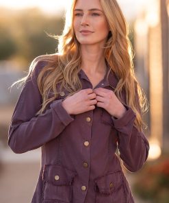 The utility safari jacket is now in our luxurious Taissa Twill, to provide you with fall-ready top layer. It features button-up front with a classic collar, 4 flap pockets, raw edges, and twill tape details.